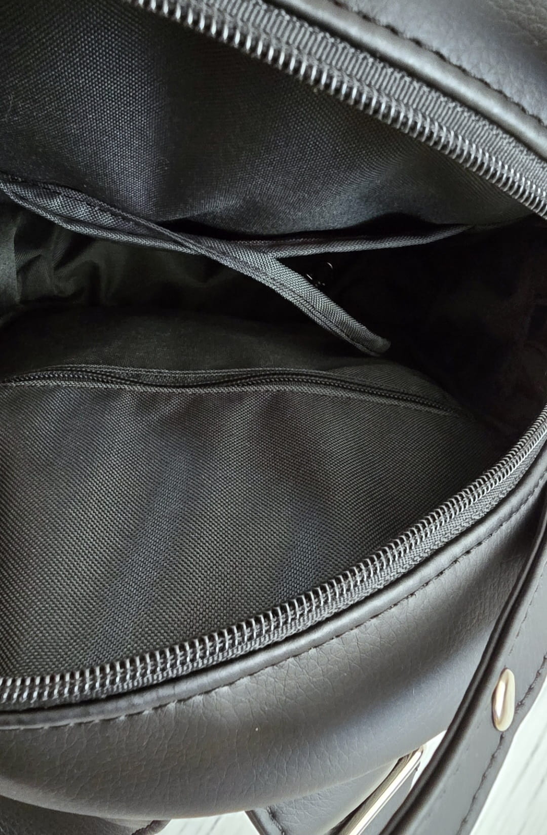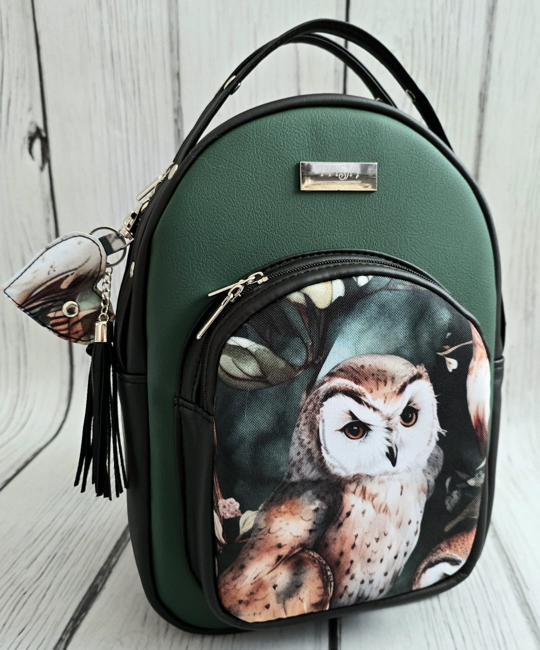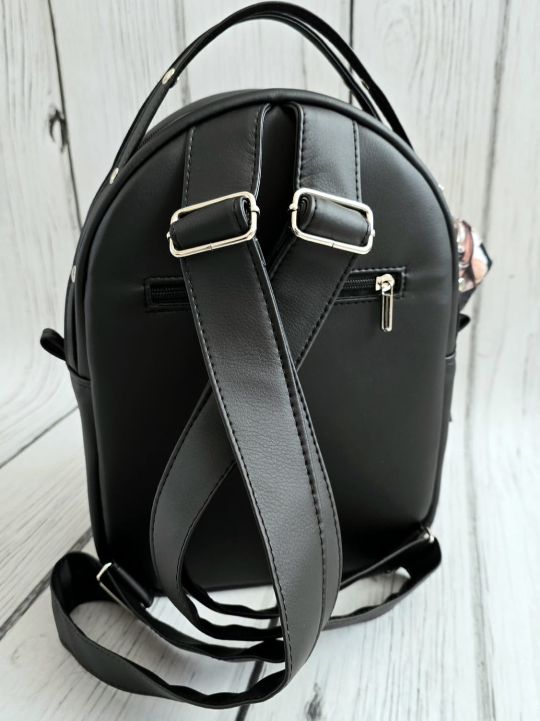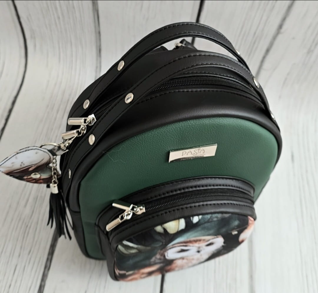 Plecak uszyty z ekoskóry, frontowa kieszeń z tkaniny wodoodpornej z nadrukiem. Wewnątrz podszewka wodoodporna. Kieszeń zewnętrzna na zamek, plus duża komora. Wewnątrz kieszonka na zamek, kieszonka otwarta i smycz na klucze. Kieszeń zewnętrzna na plecach jest opcjonalna, nie ma jej w podstawowej wersji, uszyta będzie po zaznaczeniu okienka.