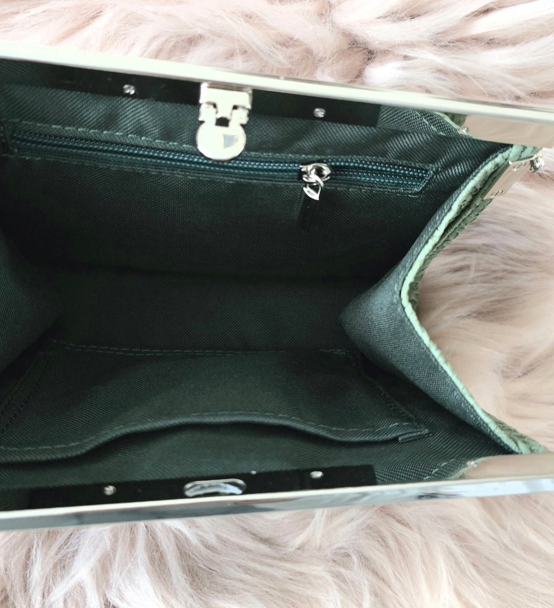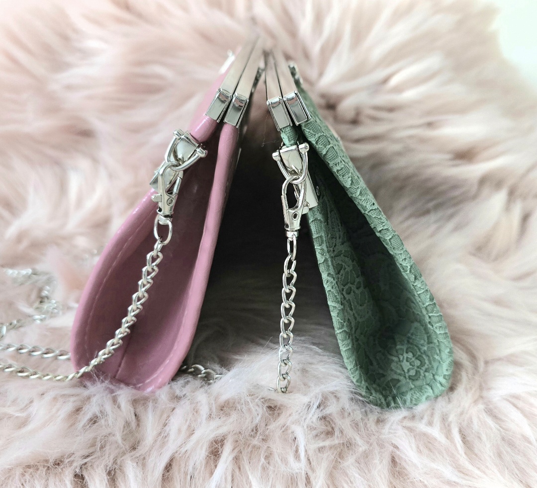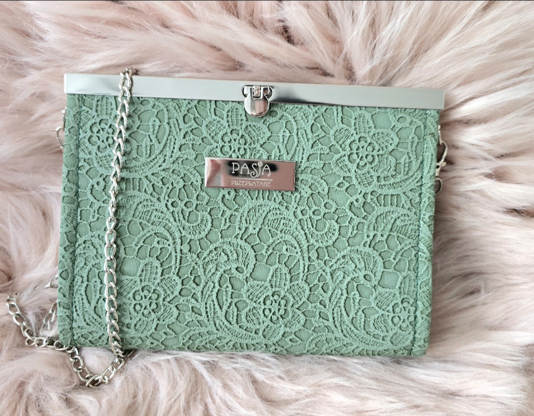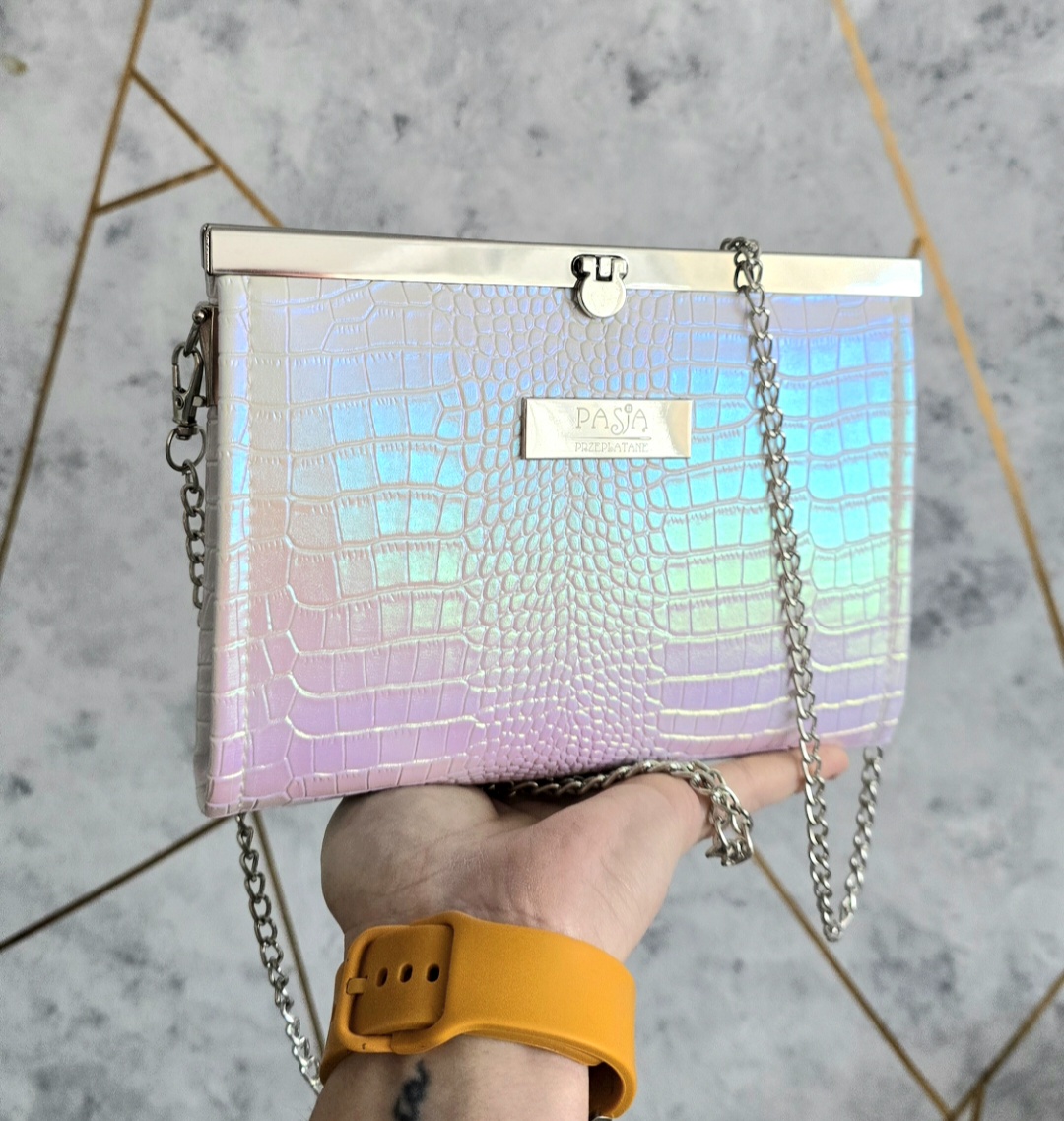 Torebka kopertówka uszyta z ekoskóry, lekko usztywniona. Zapinana na zapięcie wkładane. W środku mała otwarta kieszonka i kieszonka na zamek. Łańcuszek długość 120cm. Można nosić na łańcuszku, lub odpiąć go i nosić w ręku. Torebka mieści duży telefon Iphone 15 Pro Max, lub Samsung S25 Ultra ( największe modele), jest jeszcze miejsce na puder, pomadkę, chusteczki, czy kluczyki. Dzięki dużemu metalowemu zapięciu wygląda bardzo elegancko.