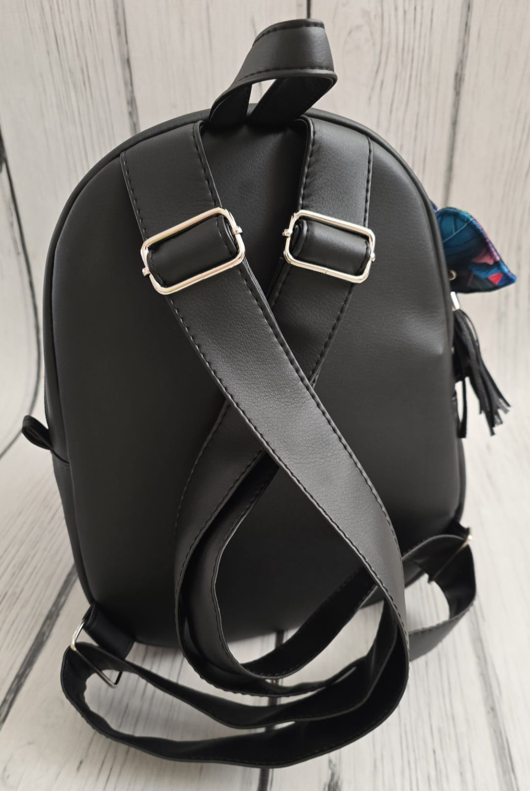 Plecak uszyty z ekoskóry i weluru tapicerskiego- panel przedni, wewnątrz podszewka wodoodporna. Kieszeń zewnętrzna na 2 zamki, plus duża komora. Wewnątrz kieszonka na zamek, kieszonka otwarta i smycz na klucze. Brelok w komplecie.