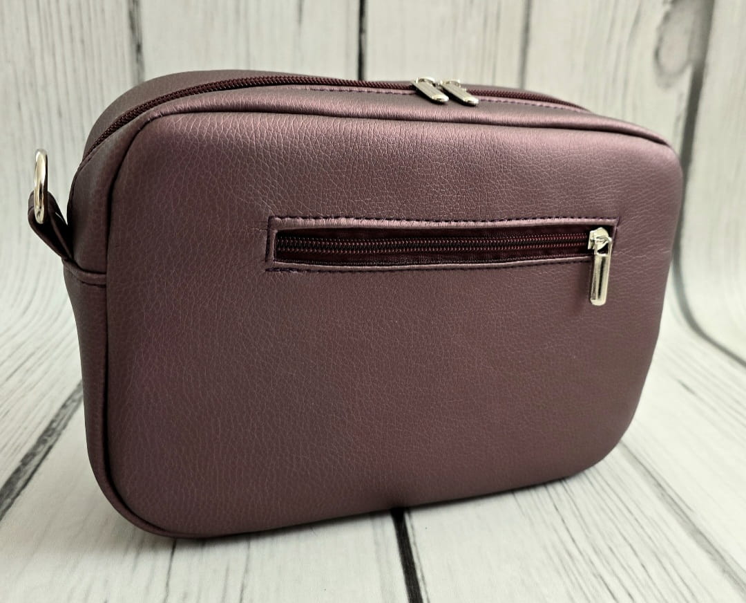 Torebka typu box, uszyta z ekoskóry. Wodoodporna podszewka, dwie kieszonki w tym jedna na zamek, oraz smycz na klucze. Pasek regulowany do 135 cm. Brelok w zestawie.